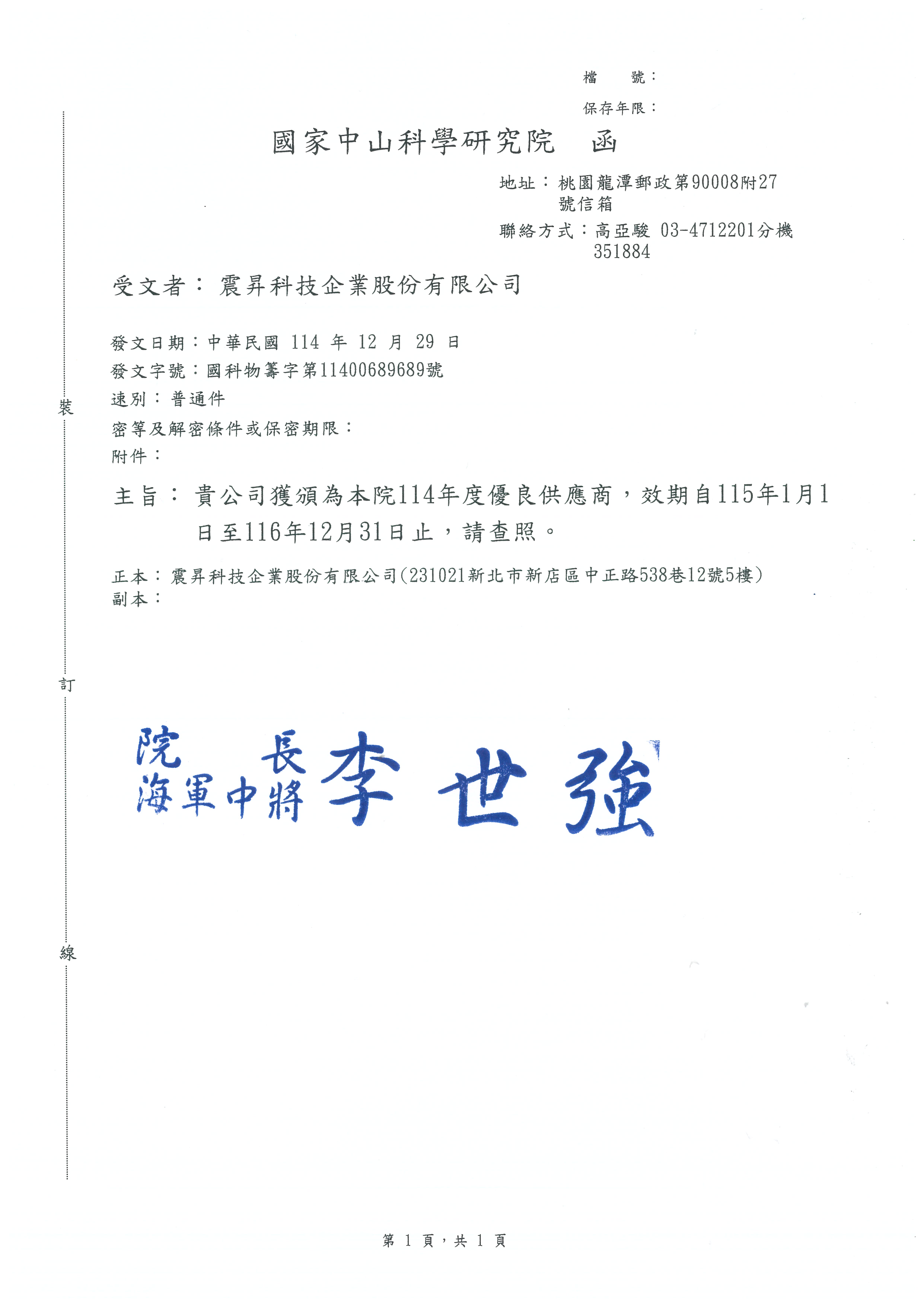 中科院114年度優良供應商